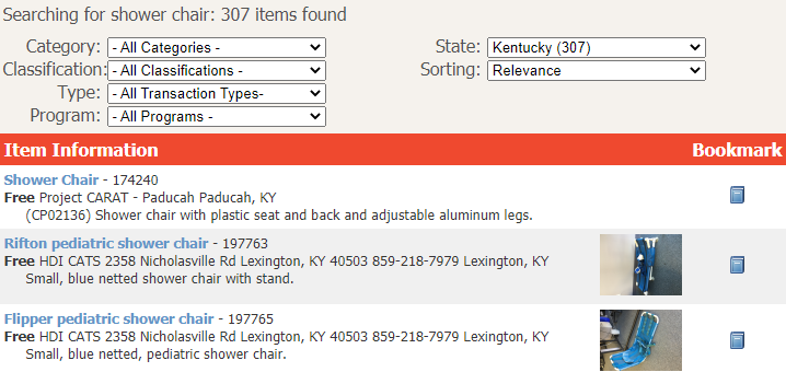 The example in the screenshot presented here has us searching for a “shower chair”. It is important to note that the search will identify all matches of the phrase “shower chair” as well as all instances of the words “shower” and “chair”. The database searches both the Item Name field and the Item Description field of the database. The results are in order of relevance with those matching the exact phrase “shower chair” first, followed by those matching only the word “shower” and lastly those matching the word “chair”. It is also important to note that searches for “shower chair” (two words) and “showerchair” (two words) will yield different results. At the time of this article, searching “shower chair” (two words) returned 307 results; searching “showerchair” (one word) returned zero results.
